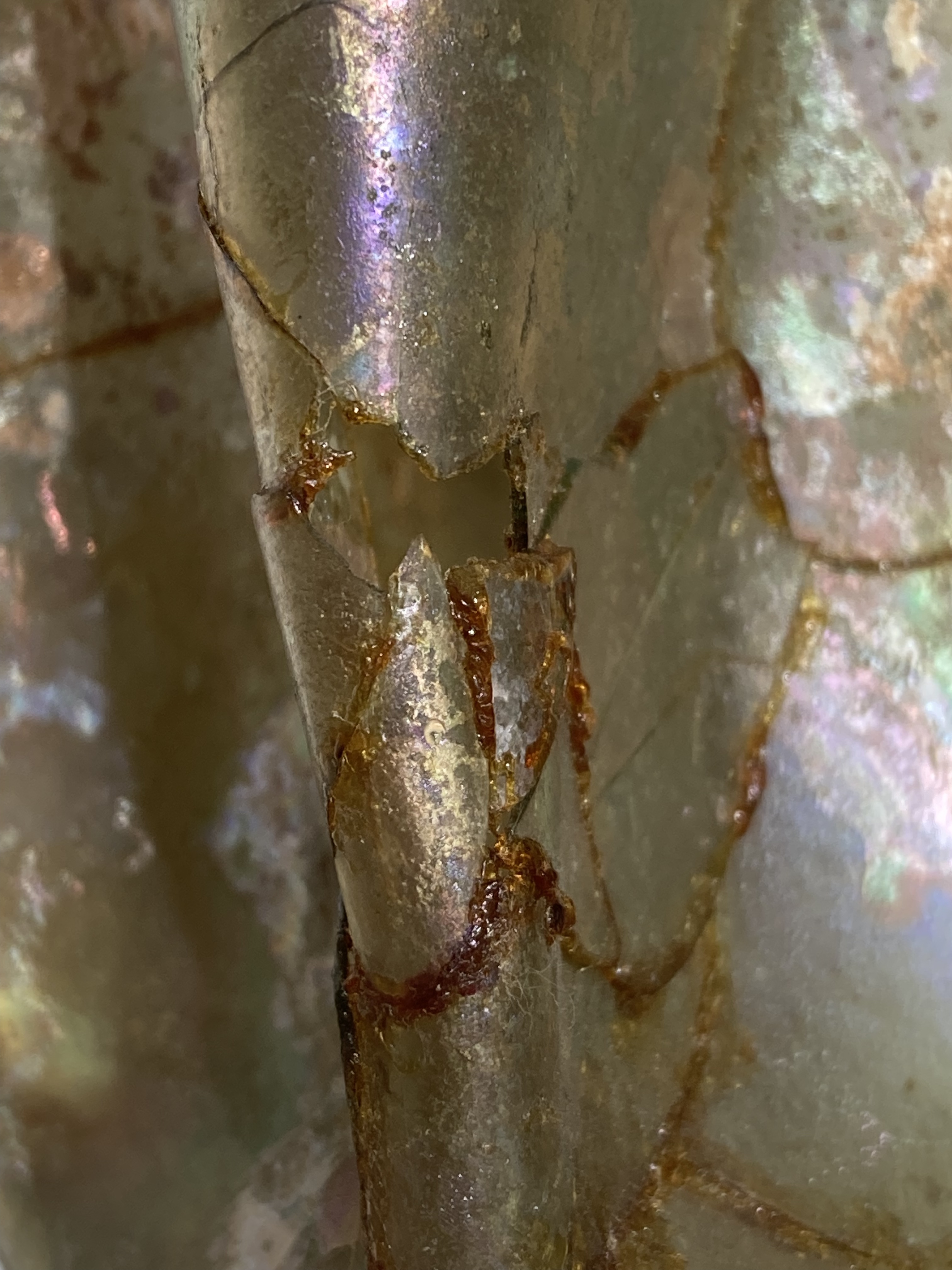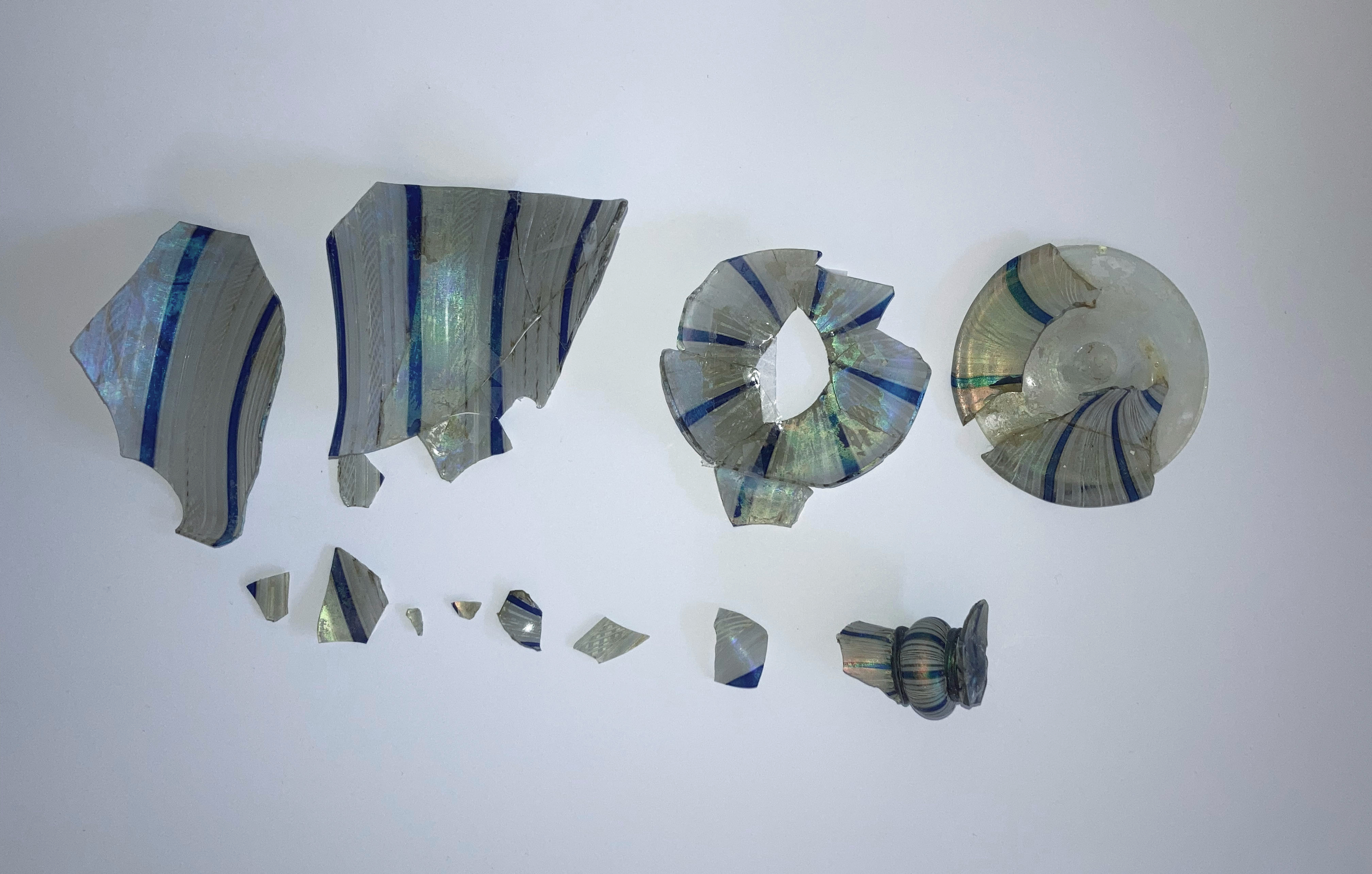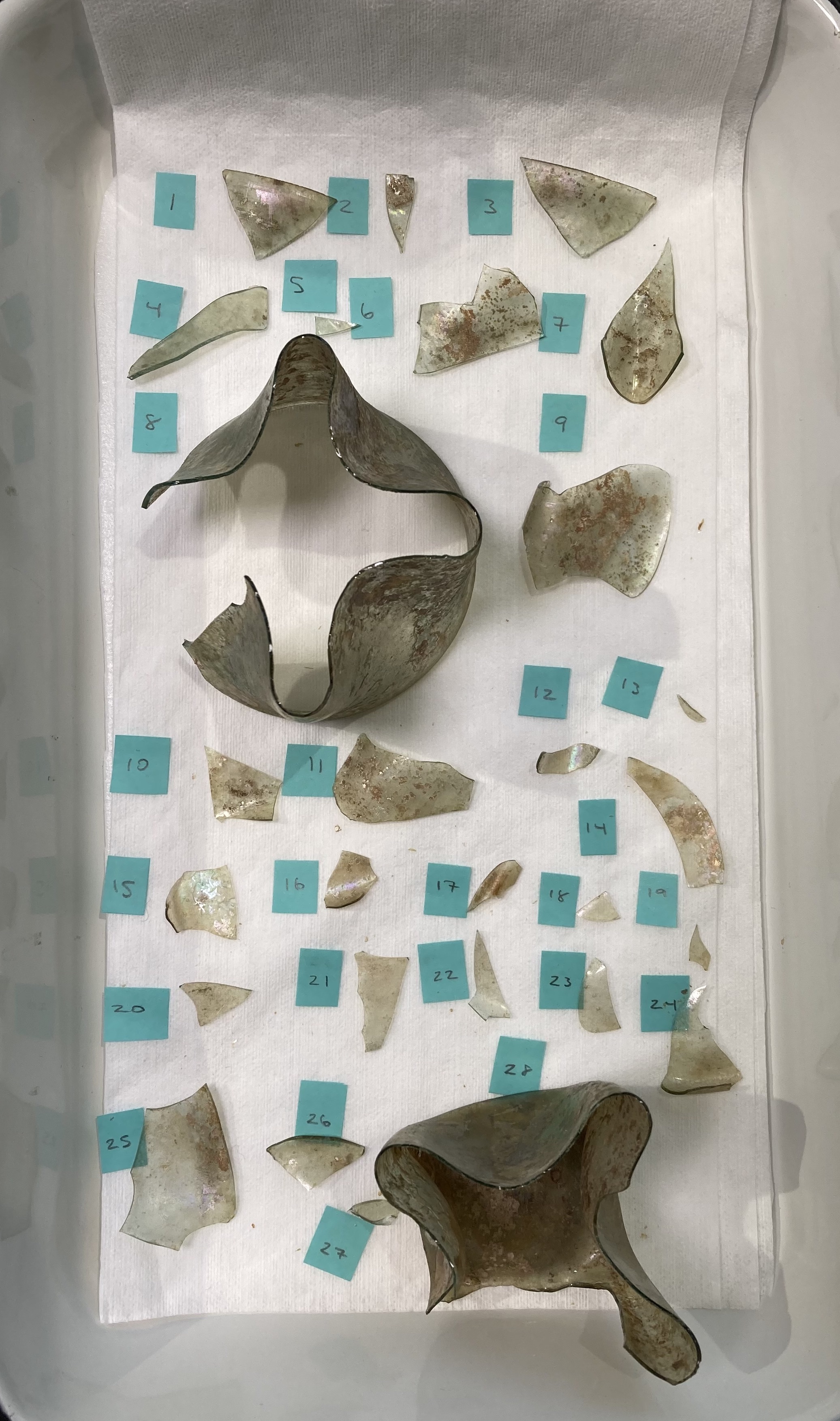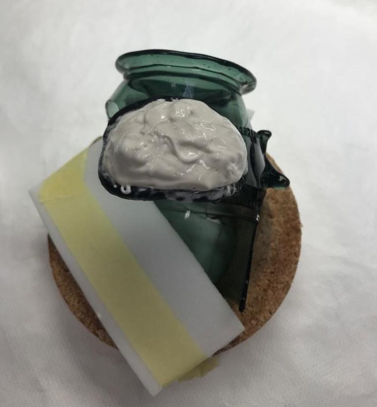 Treatment of a previously adhered ancient glass folded beaker from Syria (1st-3rd cent) at the Corning Museum of Glass. The glass is weathered and fragmented but had been restored before coming into the museum’s collection. The old adhesive, animal glue, was removed by first swelling it with warm water. The object was dismantled, and all the old animal glue was cleaned away. The fragments were re-adhered using Paraloid B-72, which is a more stable adhesive.