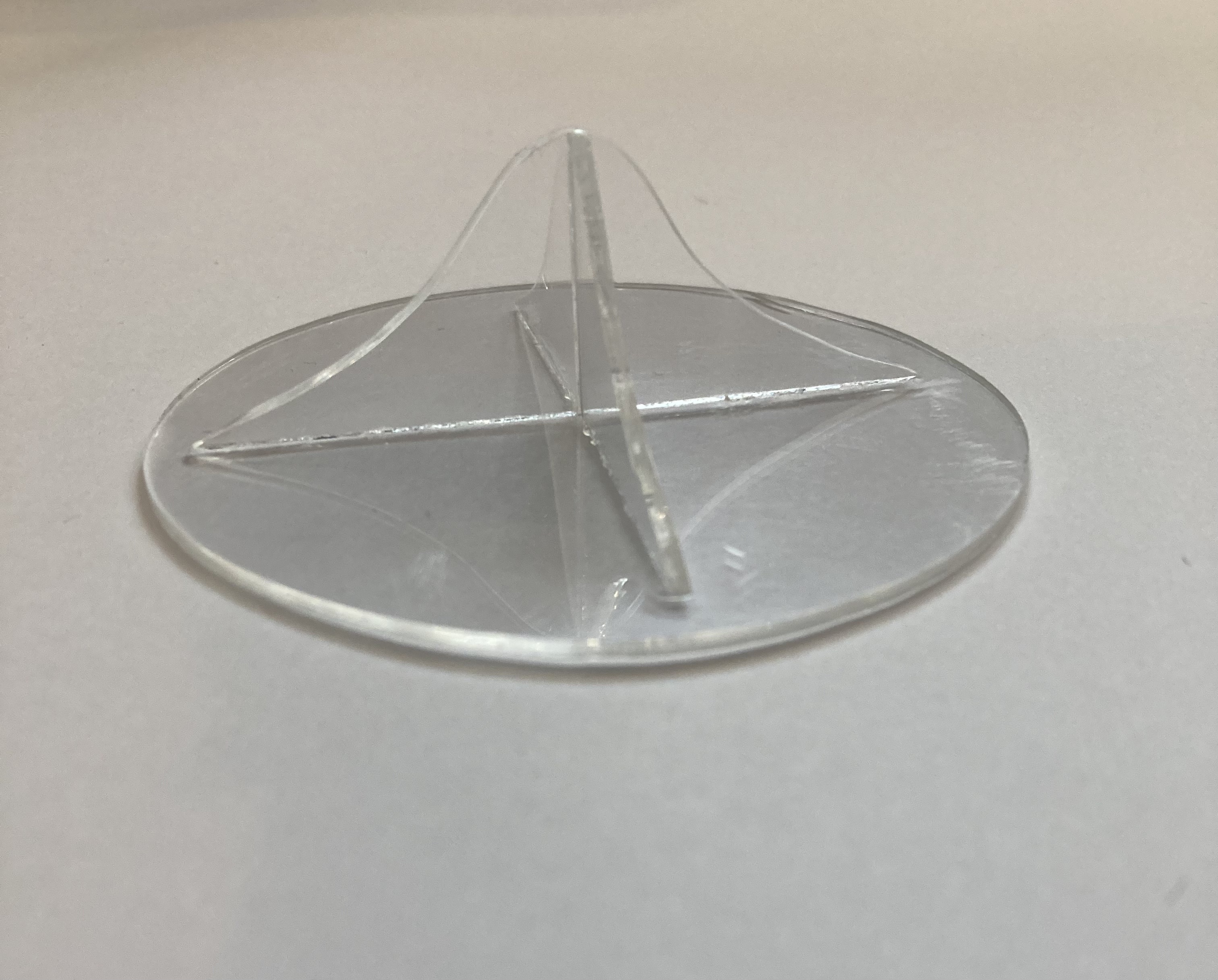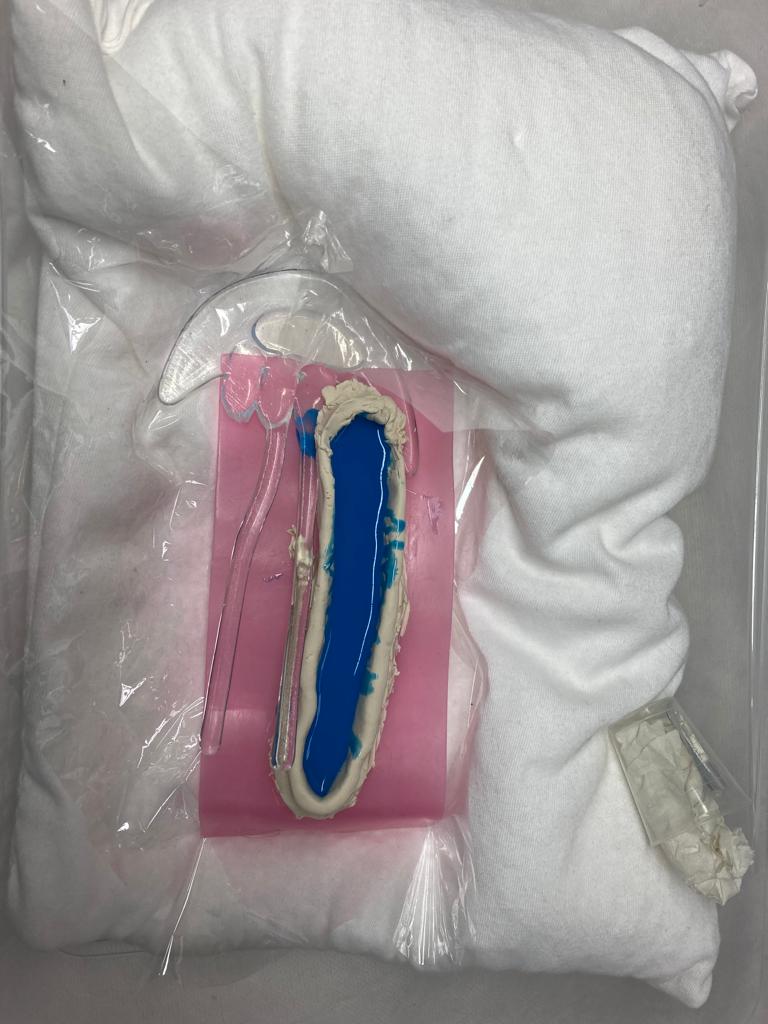 Treatment of a fused glass object with bent, alternating tentacles so that it is free-standing. The jellyfish was made within the last five years in the Netherlands. A reconstruction was made of a missing tentacle, restoring the aesthetic nature, and allowing the object to stand on its own again. This was done by making a silicone rubber mould of one of the surviving tentacles and casting the reconstruction with HXTAL-NYL-1 epoxy resin, which was manipulated when it was partially set to match the bent nature of the tentacles.