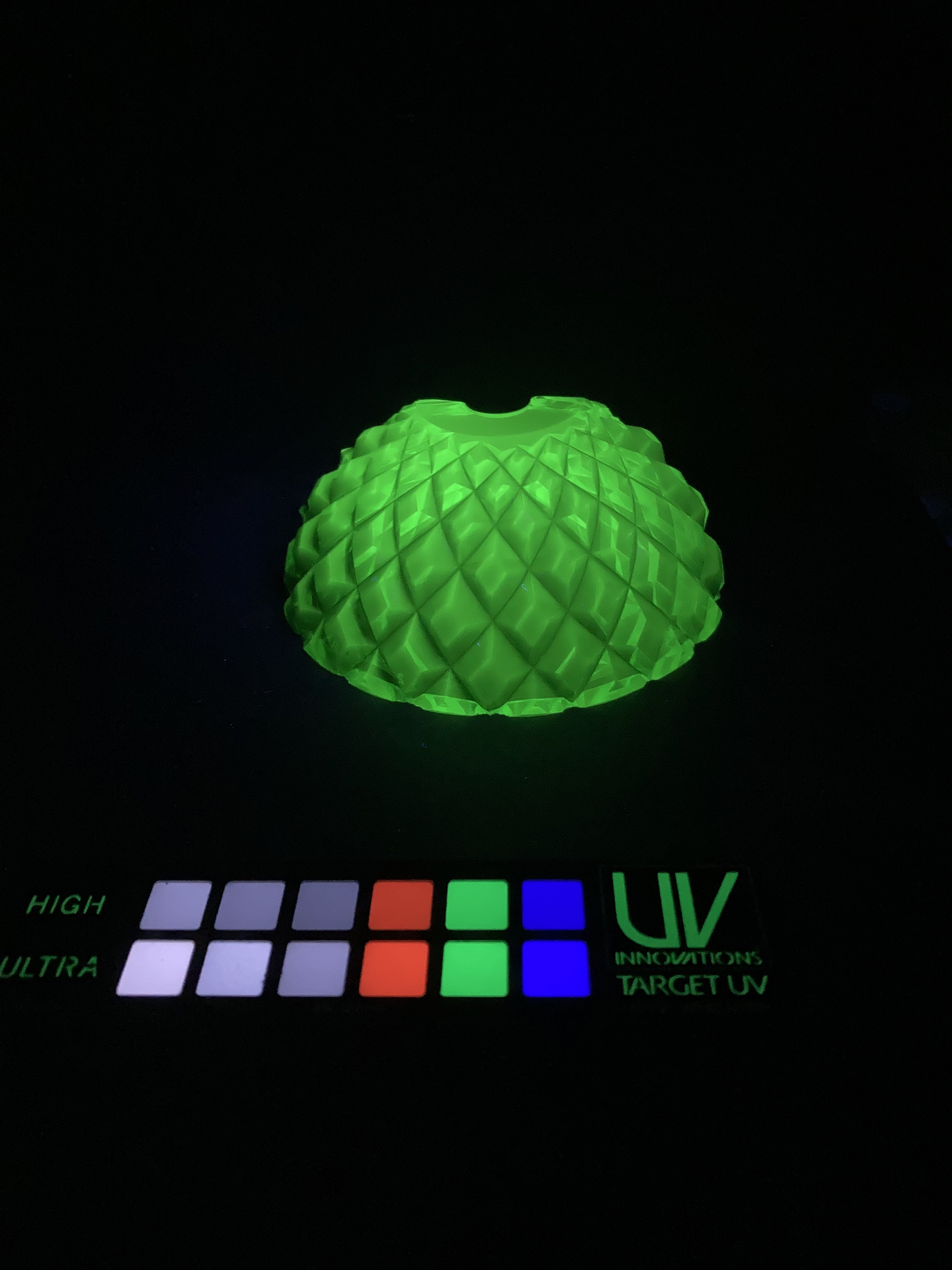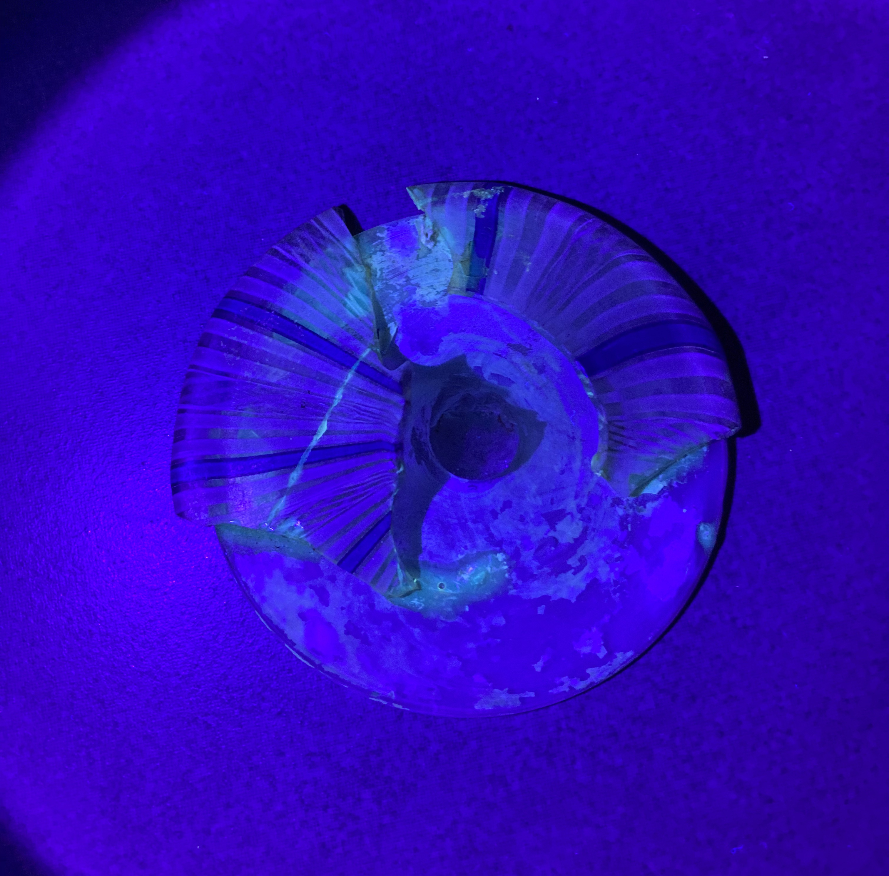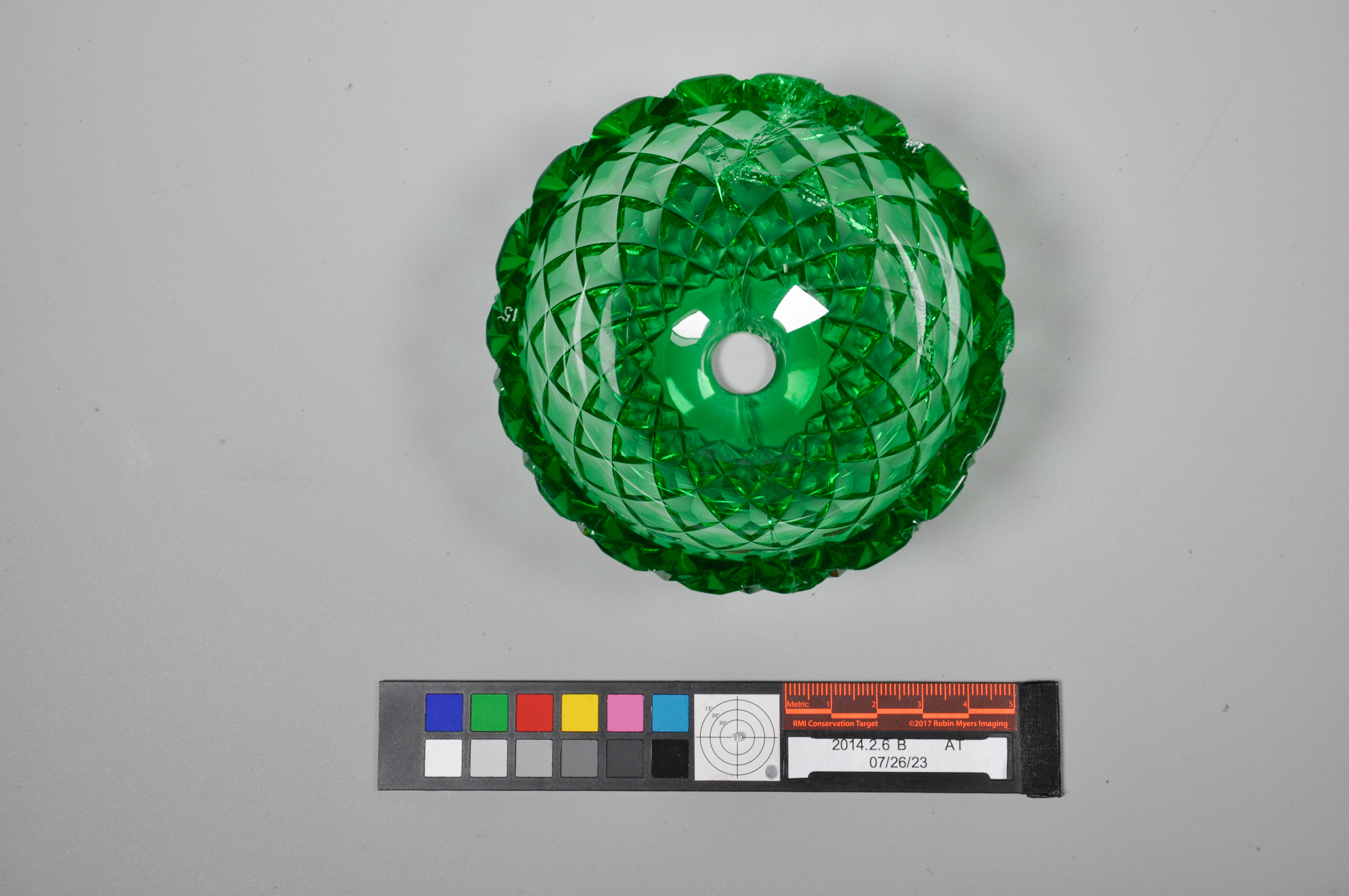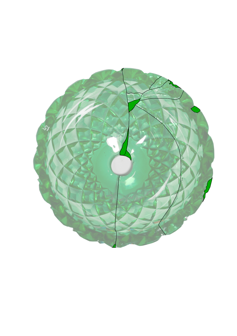 Treatment of a part of a uranium glass wall sconce from the F. & C. Osler Company. Remove old adhesive in a solvent chamber. Then re-adhere with Paraloid B-72. Was able to fit in many more small fragments and ensure a tight alignment.