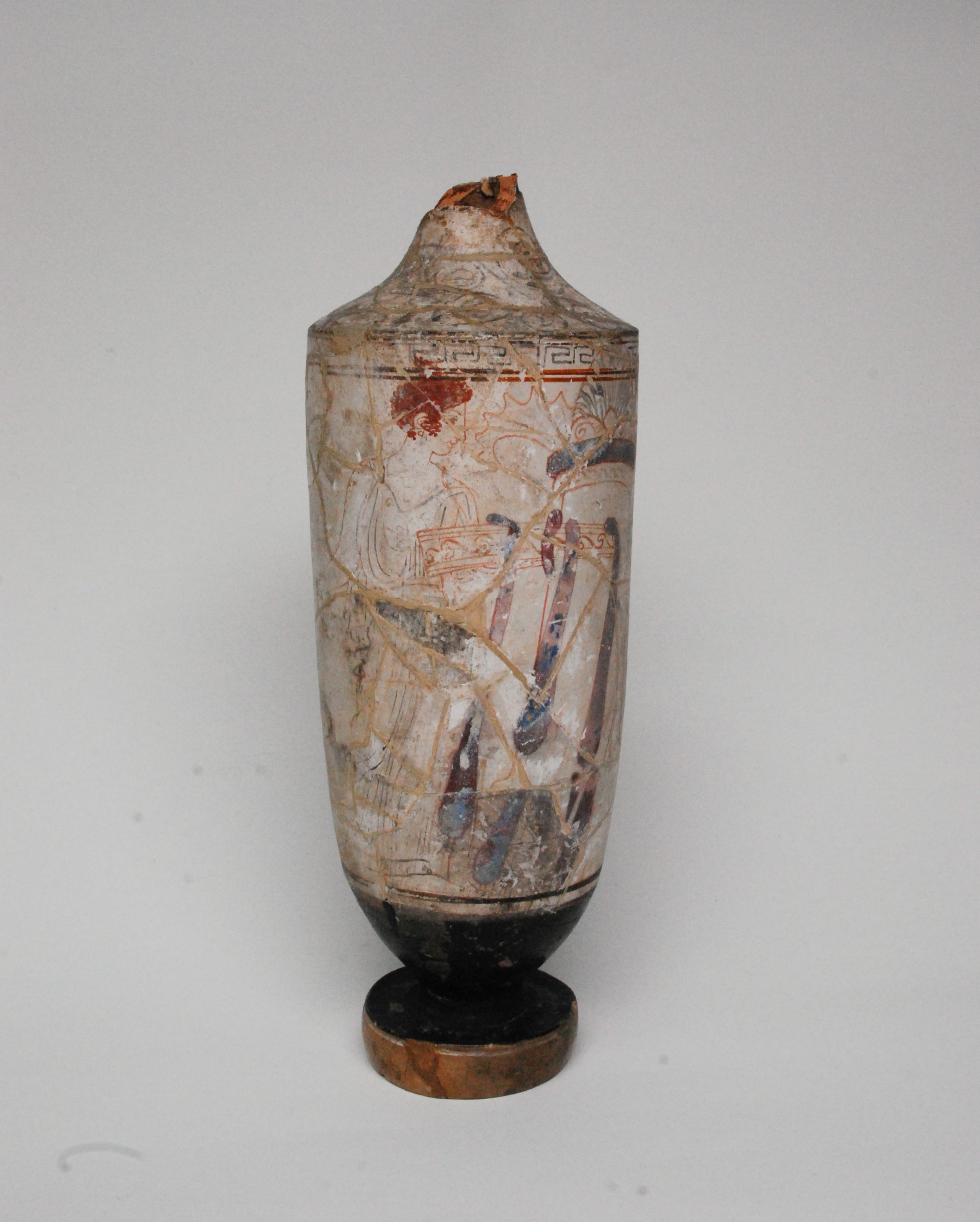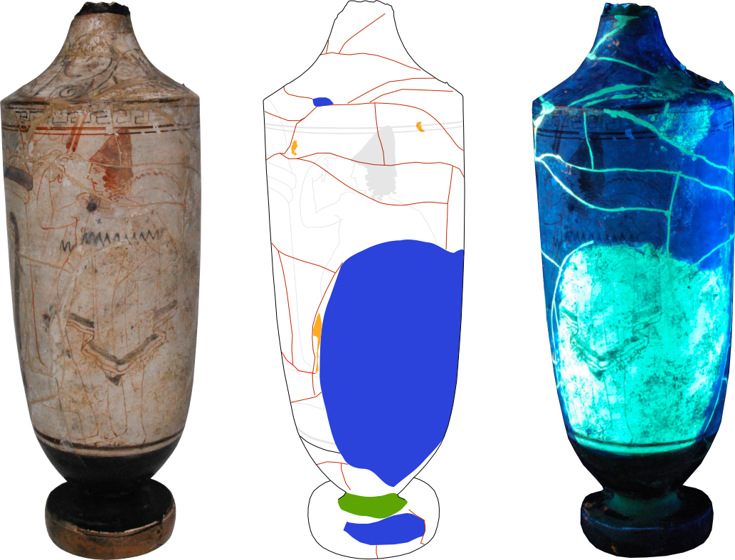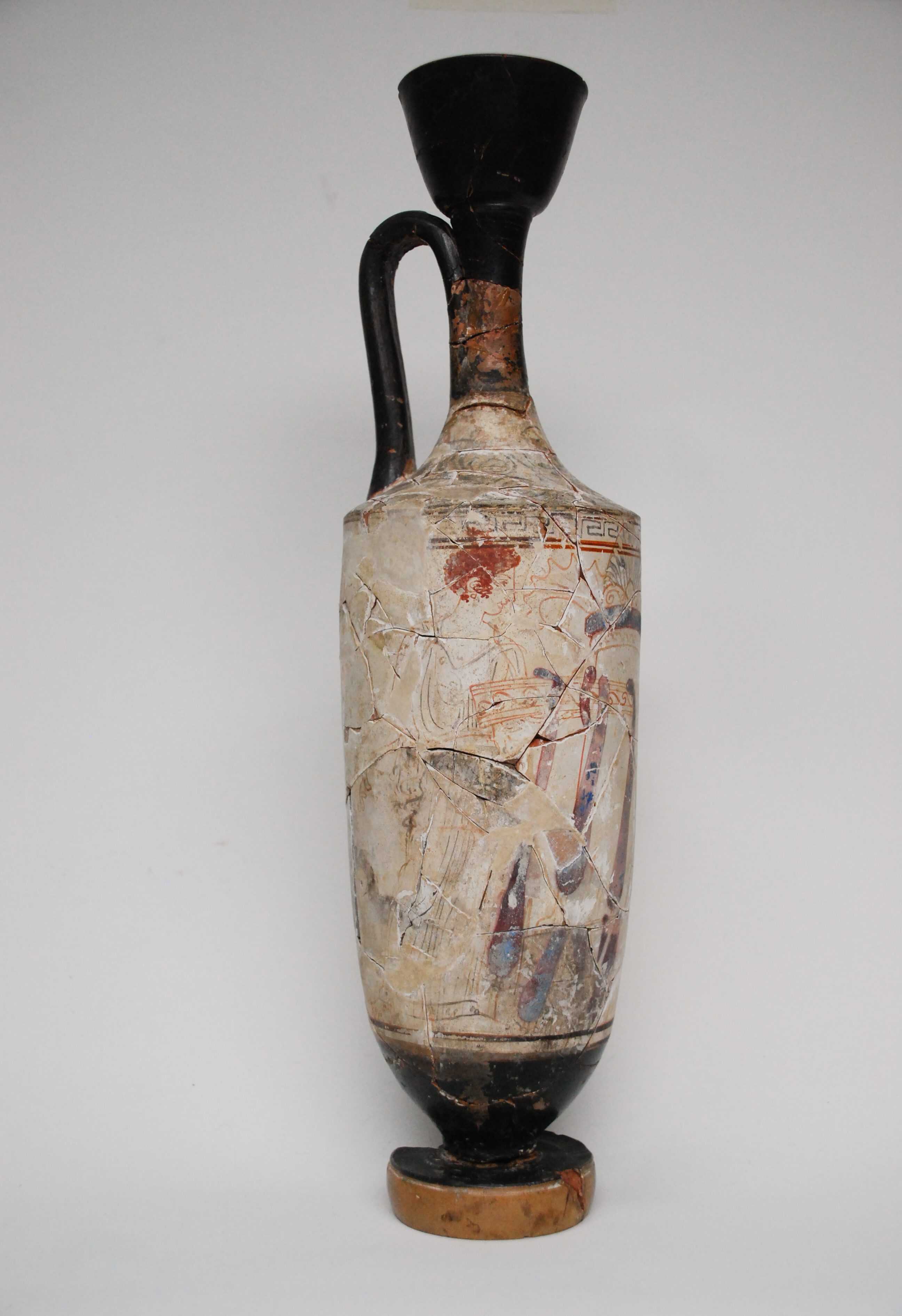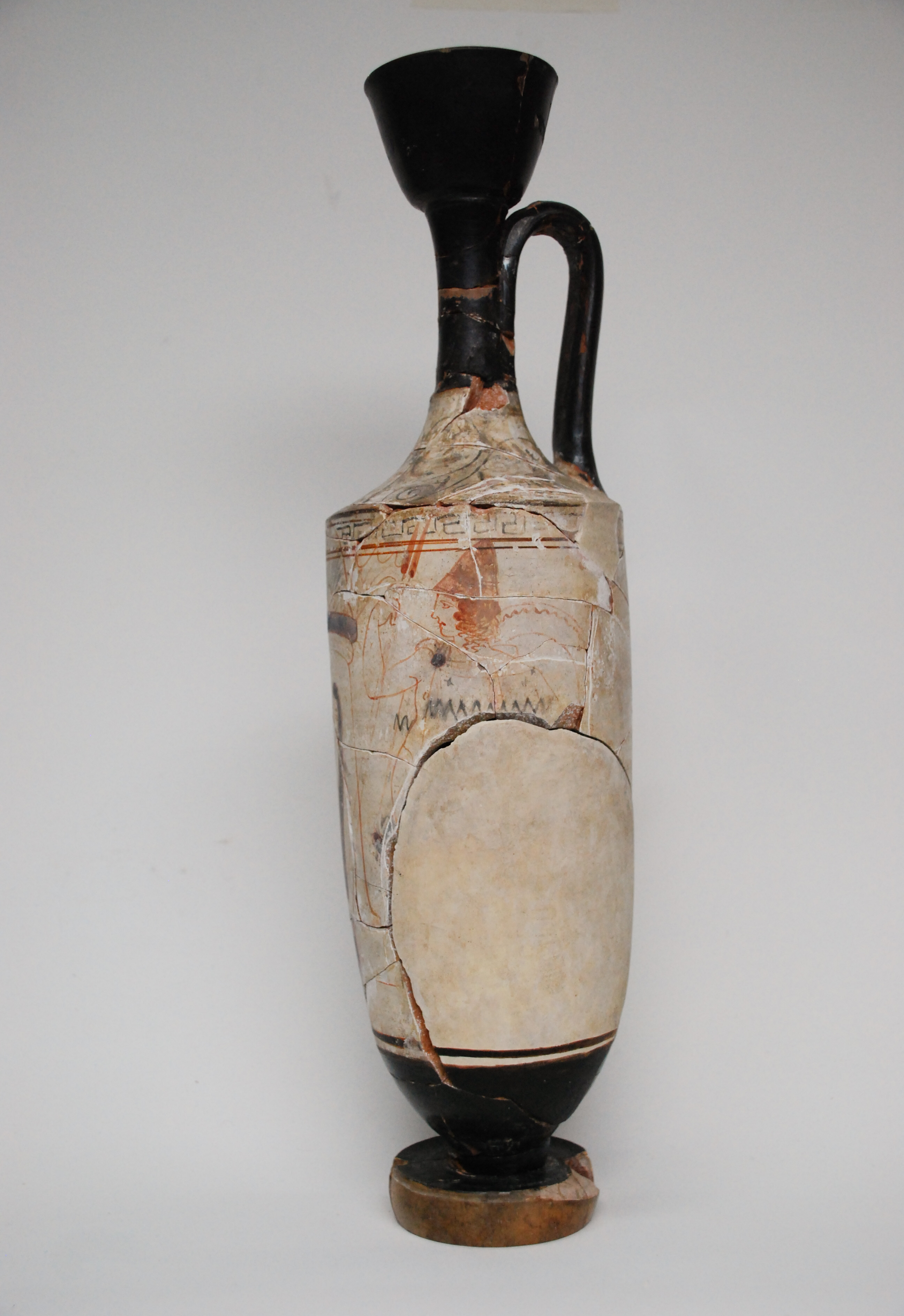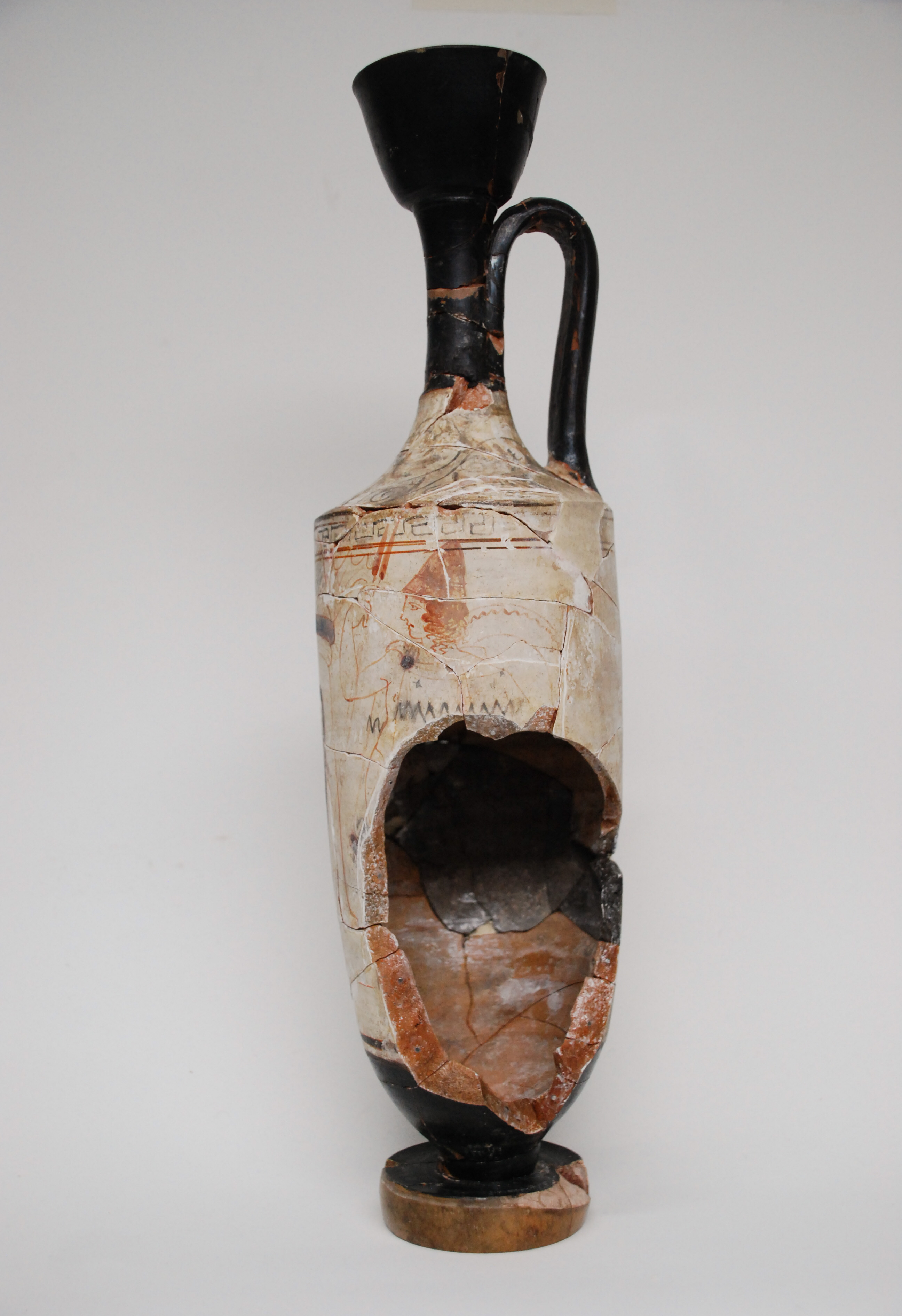 Treatment of an ancient Greek white-ground lekythos. Previously applied restoration materials and shellac adhesive were removed and the fragments cleaned. The fragments were then re-adhered and new fills made. Using magnets, the large fill on the side of the object was made detachable, so that it can be placed on and off the object as desired.