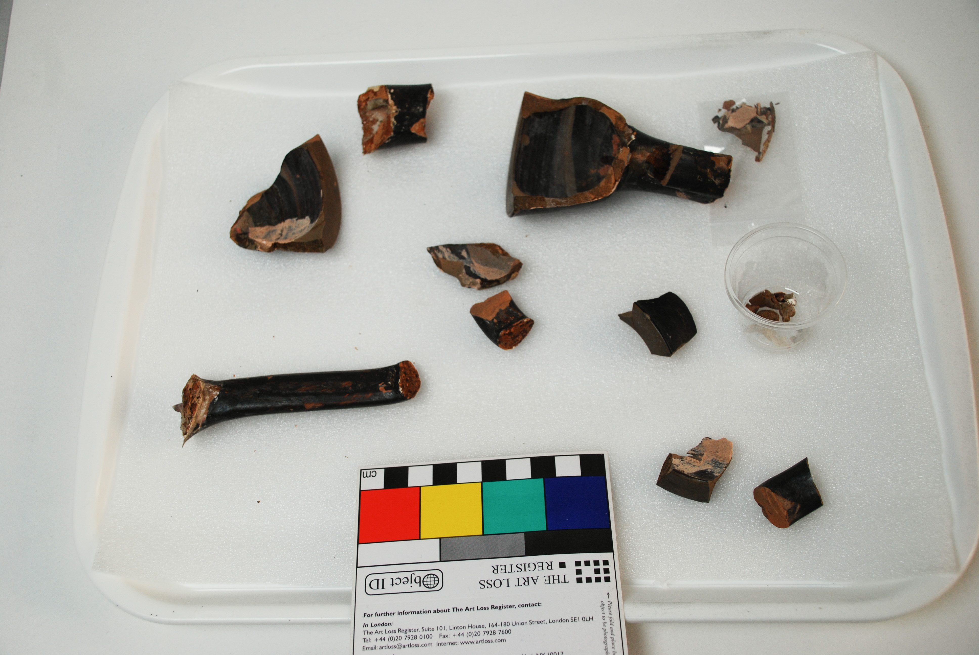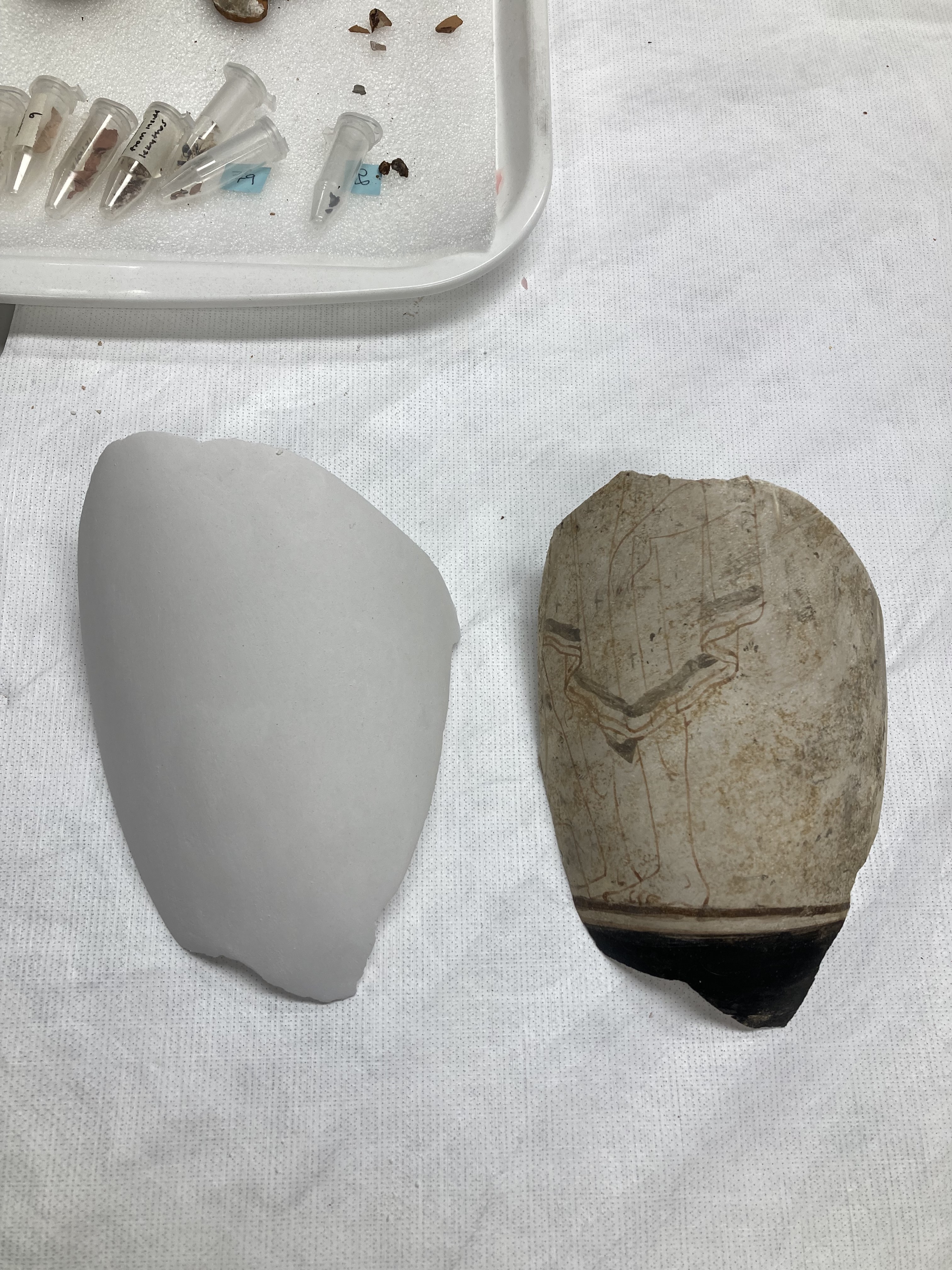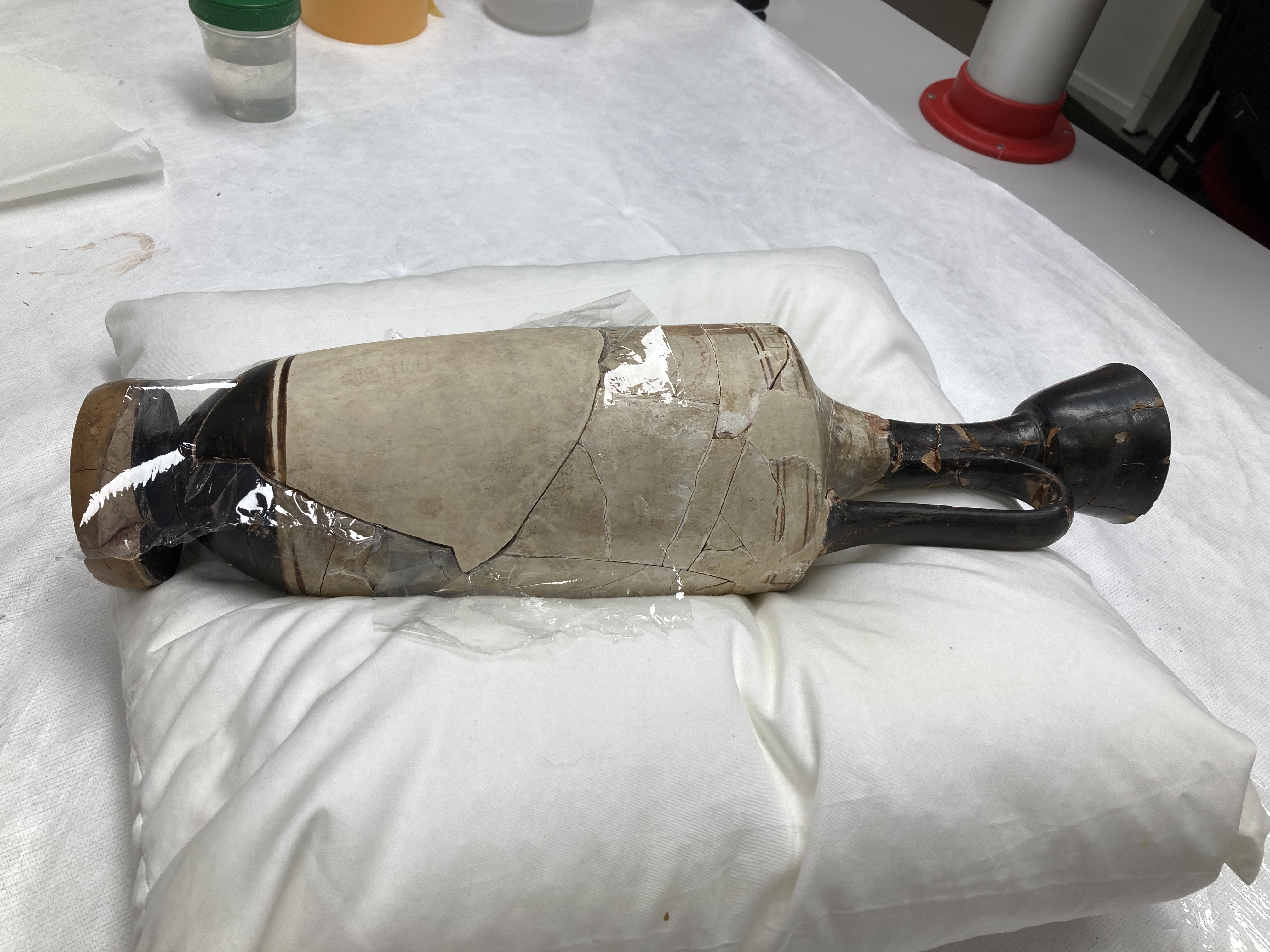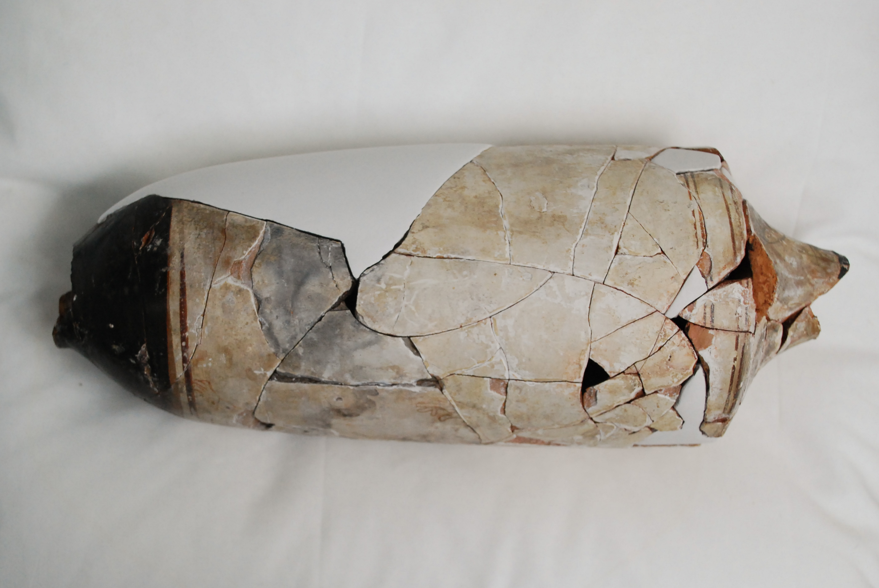 Treatment of an ancient Greek white-ground lekythos. Previously applied restoration materials and shellac adhesive were removed and the fragments cleaned. The fragments were then re-adhered and new fills made. Using magnets, the large fill on the side of the object was made detachable, so that it can be placed on and off the object as desired.