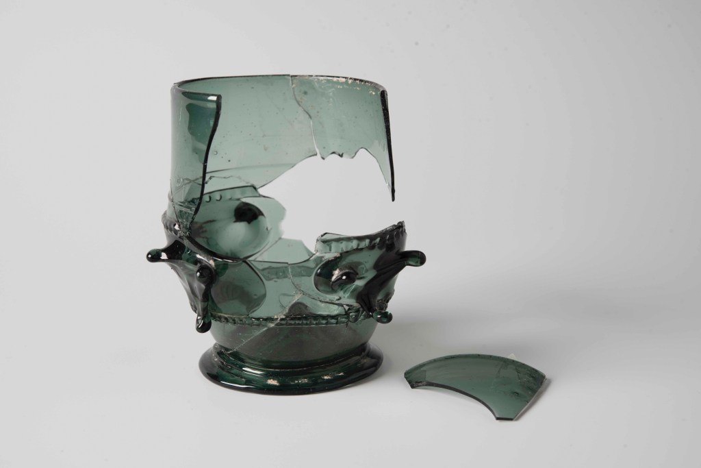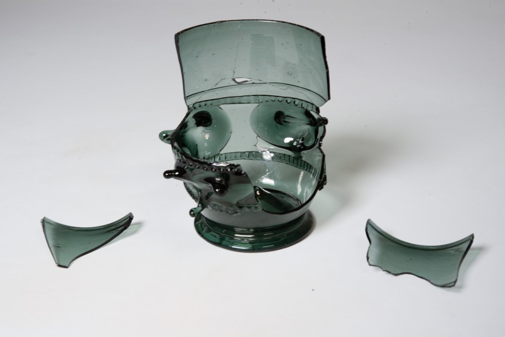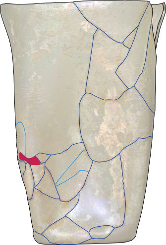 Treatment of a medieval animal-head stud forest-glass beaker from an archaeological context in Cologne, Germany. The eight fragments were cleaned and adhered with HXTAL-NYL-1 epoxy resin with a Paraloid B-72 barrier layer. Fills made from dyed HXTAL-NYL-1 were made to stabilise fragments which were not supported by other fragments. The fill material was cast as a sheet and then manipulated to the right shape and curve when the resin was partially set. An animal-head stud decoration was moulded and reconstructed using the same resin as the fill.