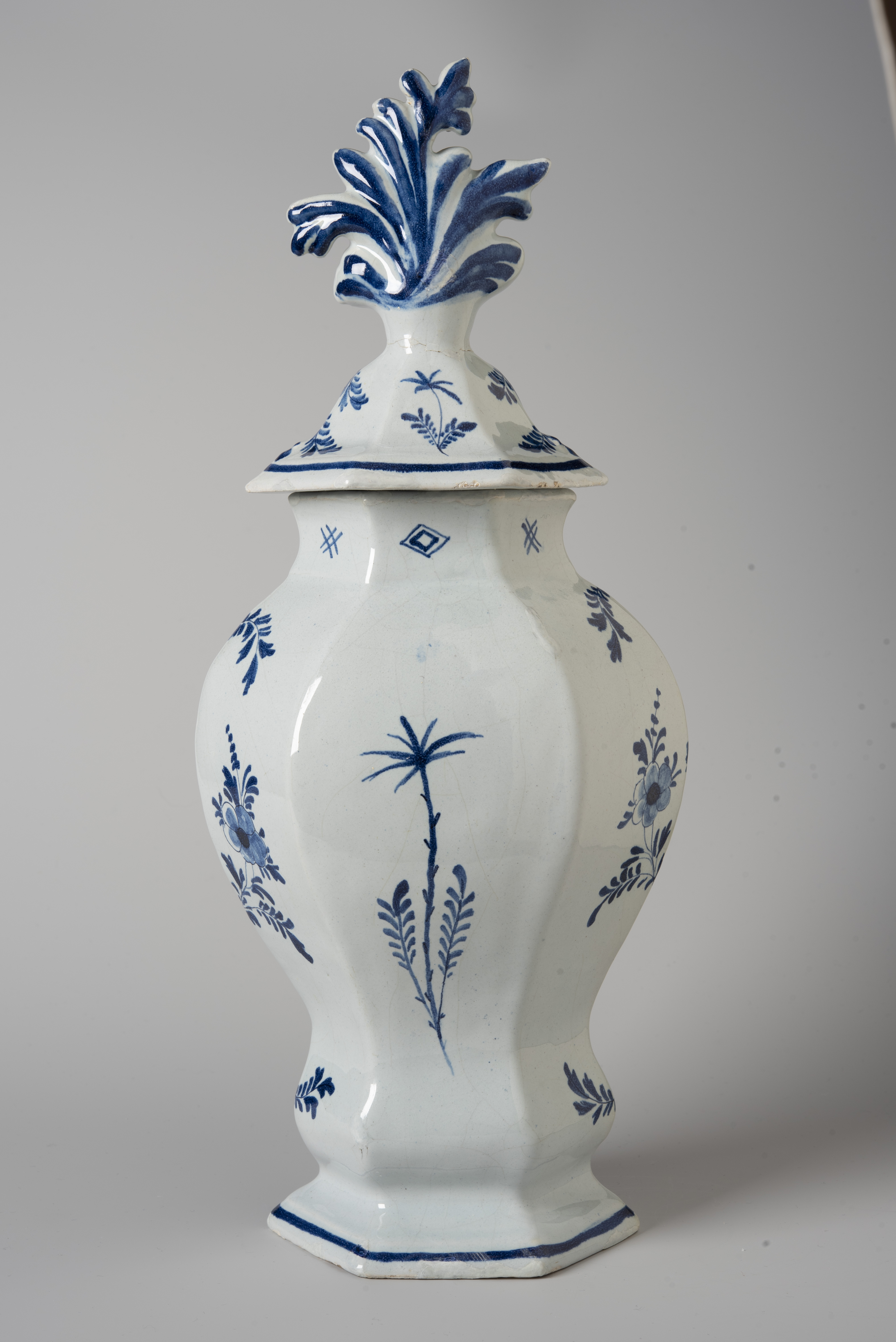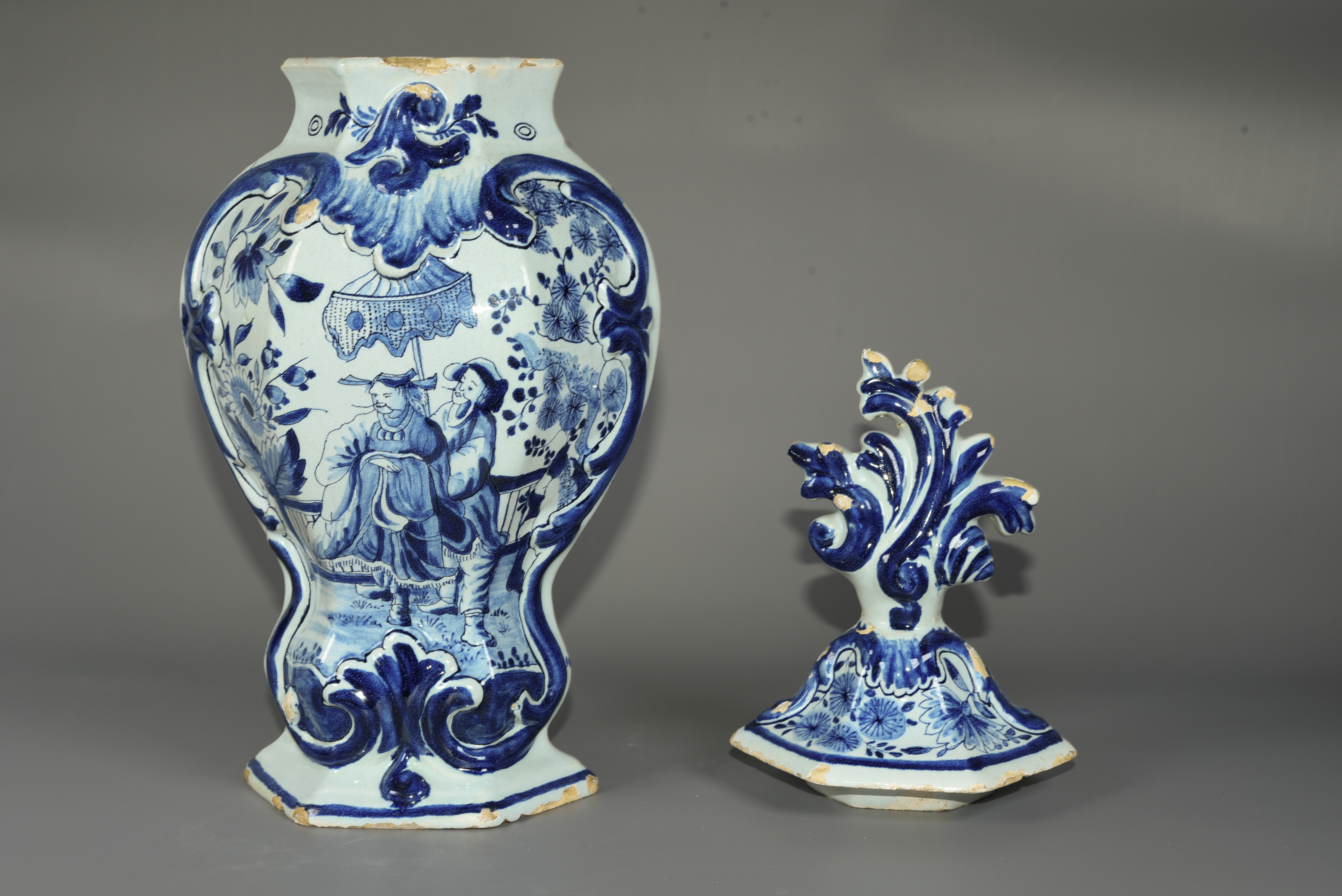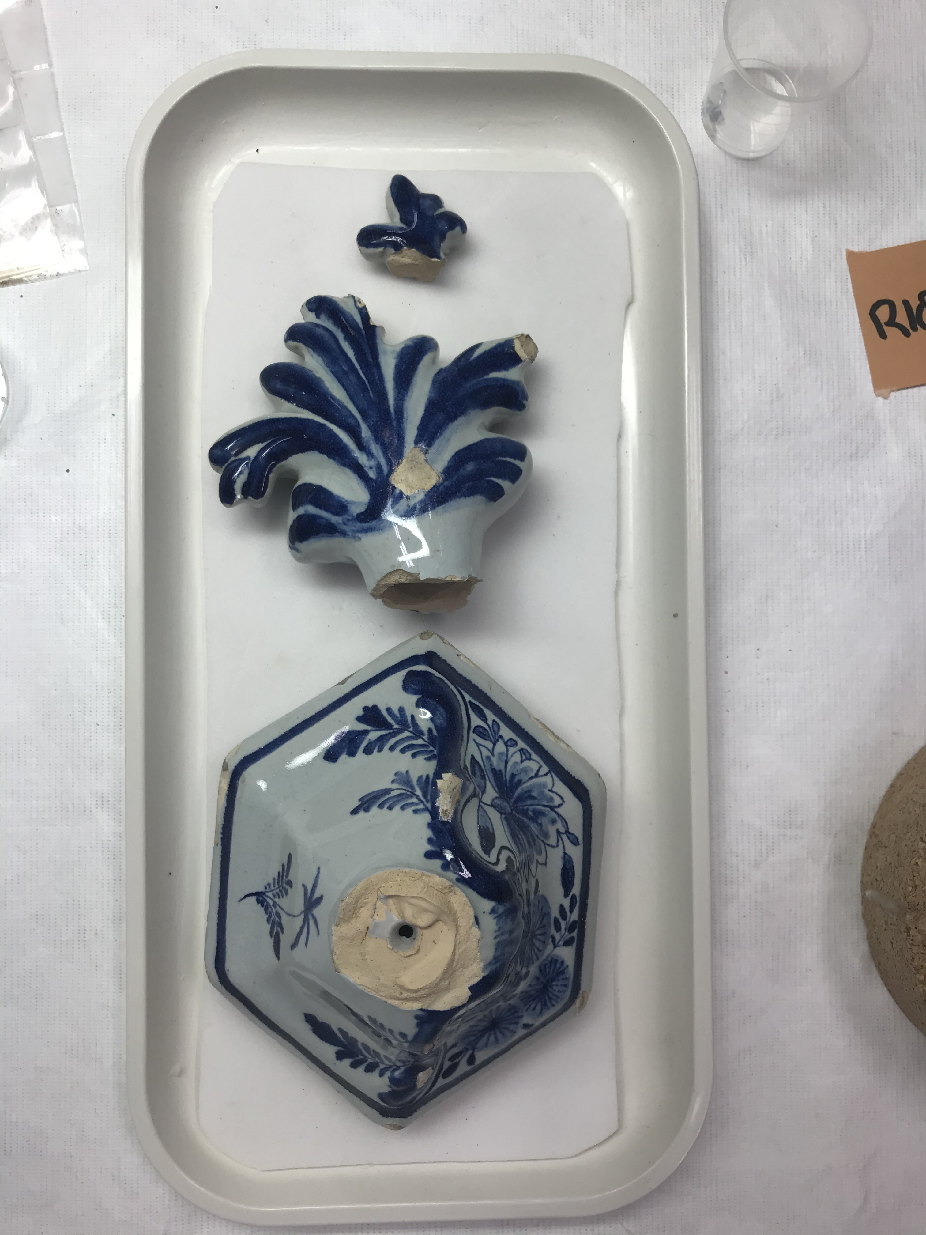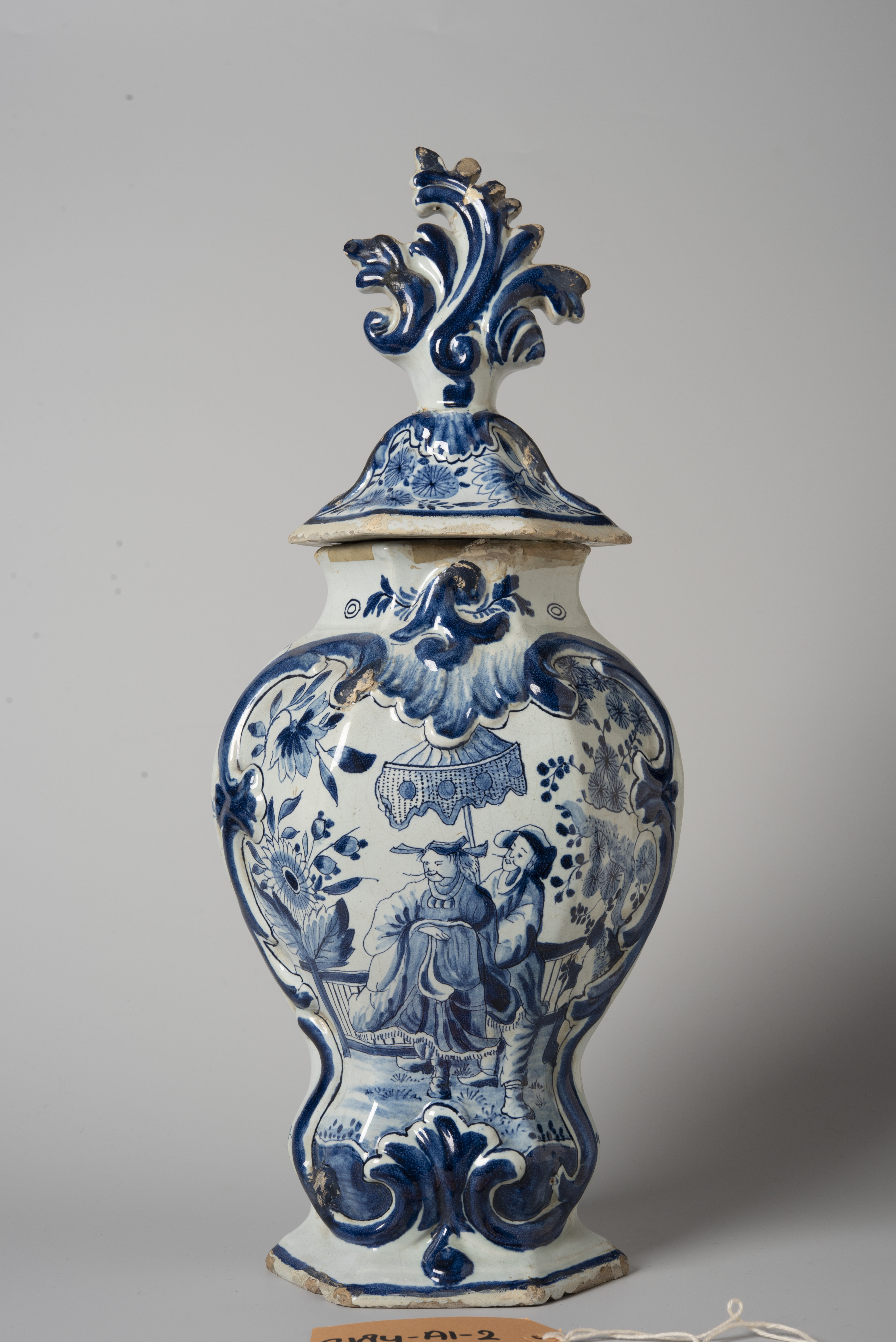 Treatment of a 19th century Dutch Delftware garniture, with an earthenware body and tin glaze. The object had disfiguring old restoration material including double-sided tape, discoloured overpaint, and unknown adhesive. The old restorations were removed, using solvents and mechanical cleaning. Glaze fragments and the fragments of the cover were adhered using Paraloid B-72. Lacuna in the ceramic and glaze were filled with Modostuc and retouched with Golden acrylics.