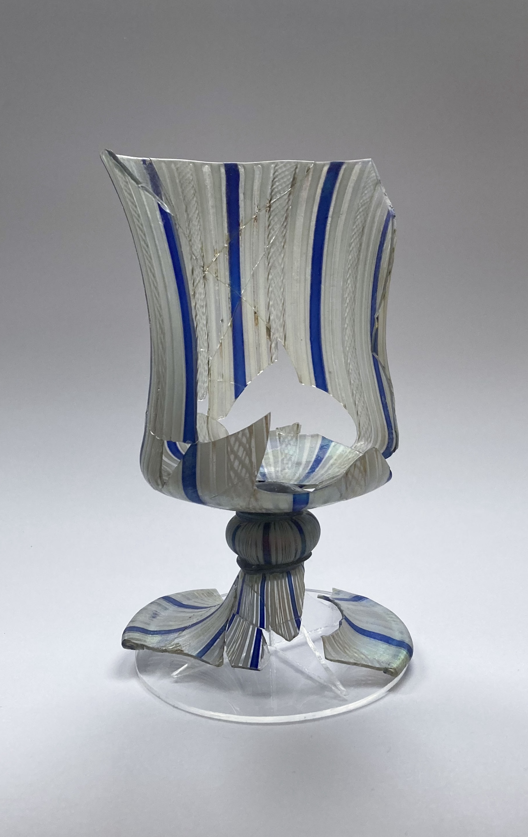 Treatment of a 16th-17th century Façon de Venise goblet which had been previously restored but had broken apart again. The old adhesive had become yellowed and brittle. The foot fragments had been adhered to a later glass foot which acted as a base. The old restoration material (including the old foot) was cleaned. The cleaned fragments were then adhered with Paraloid B-72. A support was made with plexiglass and the glass adhered to the base with Paraloid B-72.